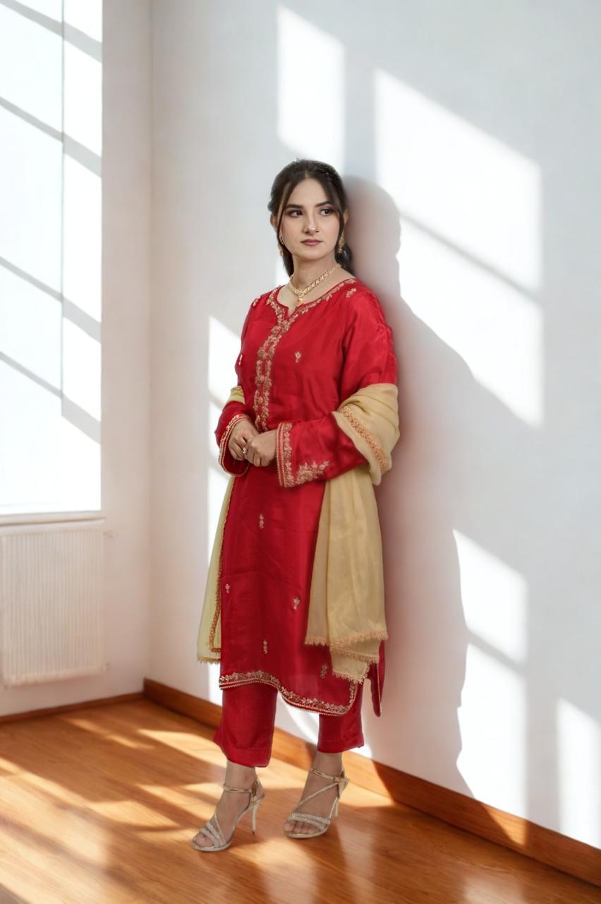 Goldenย Silk 3-Piece maxi , styled with an elegant embroidered dupatta. ๐